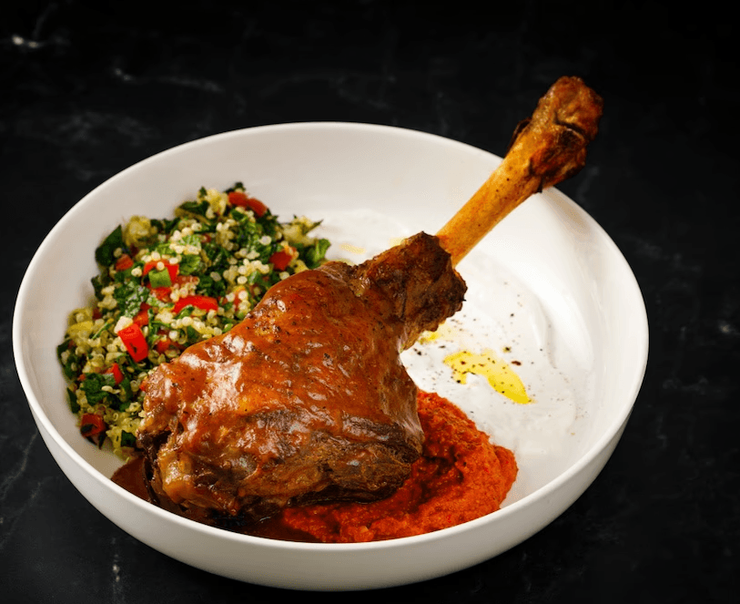 整条羊腿以各式压箱底的香料烹饪至天荒地老,佐以穆罕默热,浓缩酸奶和塔布勒沙拉。