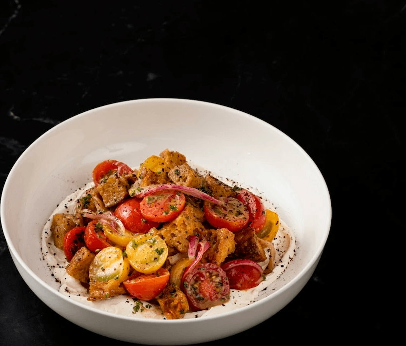 新鲜混合番茄潘扎内拉沙拉,搭配酸面包和马斯卡彭芝士