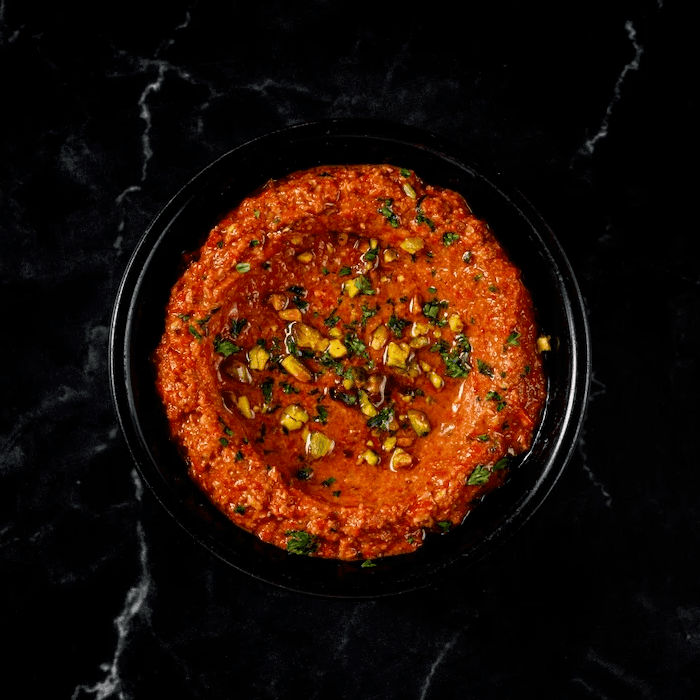 阿拉伯特色烤红灯笼椒+坚果碎+橄榄油,并佐以特制香料、配新鲜手工烤饼