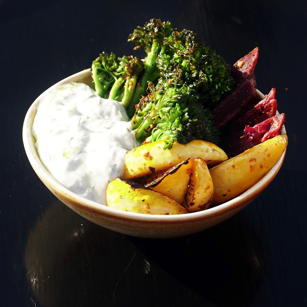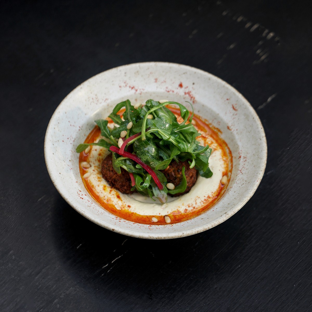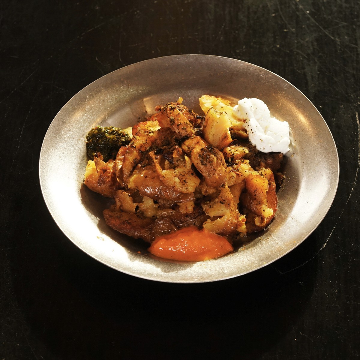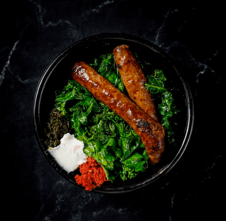 选择1 :自家灌制的牛肉肠(2根) 选择2:秘制辣味小羊肠(2根) 配羽衣甘蓝,并佐以哈里萨辣酱、蒜蓉酱和香菜酱
